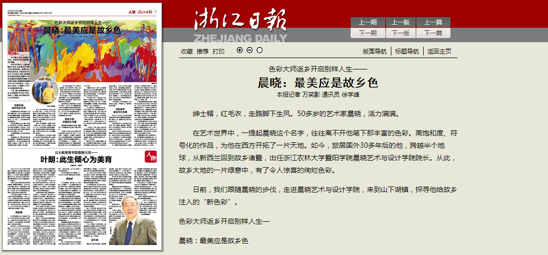 4月8日,《浙江日报》以《色彩大师返乡开启别样人生——晨晓:最美应是故乡色》为题,报道了永利官网晨晓艺术与设计学院院长晨晓。晨晓艺术与设计学院遵循学院“求真敬业、经世致用”校训,以“阳光和色彩”作为指导方针,根据学院创业型大学办学定位,坚持校地合作、产教融合的应用型办学道路,培养高水平应用型设计人才,在2018年10月21日成立,并在师生艺术馆举办了“美的世界·穿越时空”师生艺术作品展。文章介绍了旅居国外30多年的著名艺术家晨晓回到故乡,加盟永利官网,释放乡愁、服务乡村振兴和美丽乡村建设,创新教学、培养“应用创业型”人才的故事。
