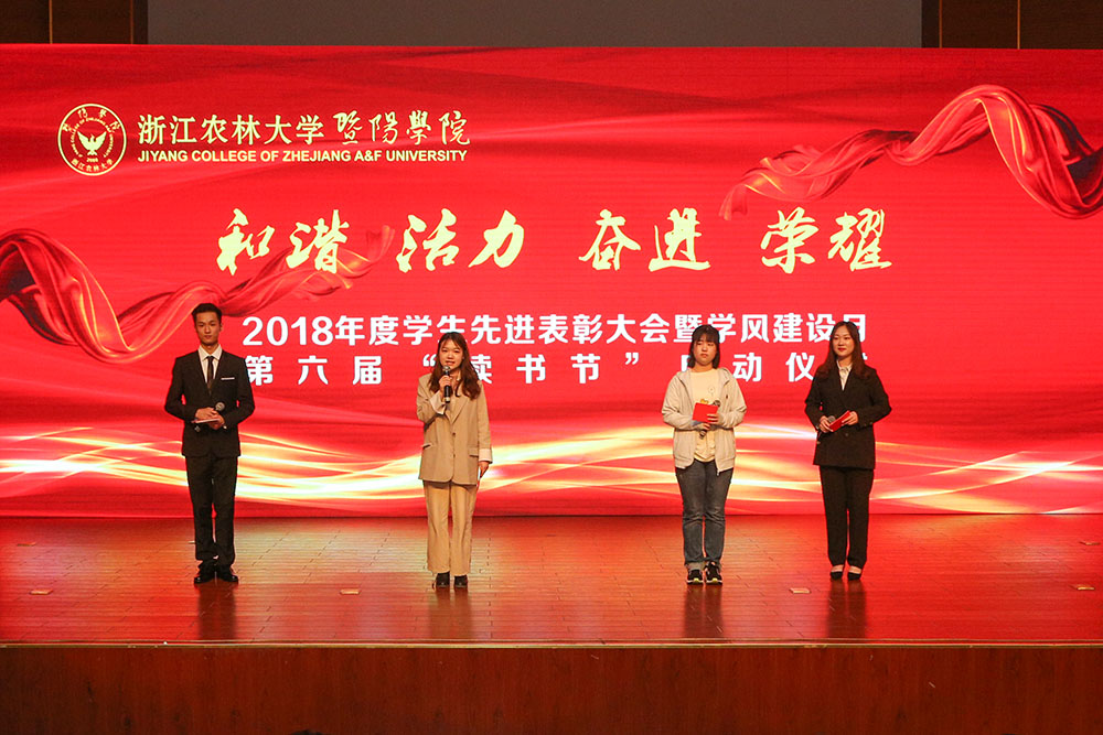 4月22日晚,浙江农林大学暨阳学院2018年度学生先进表彰大会暨学风建设月、第六届“读书节”启动仪式在学院明珠报告厅举行。77779193永利官网党政班子成员,诸暨团市委副书记何威出席活动。学院全体中层干部、辅导员和学生代表参加活动。
