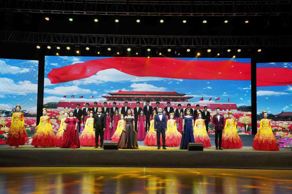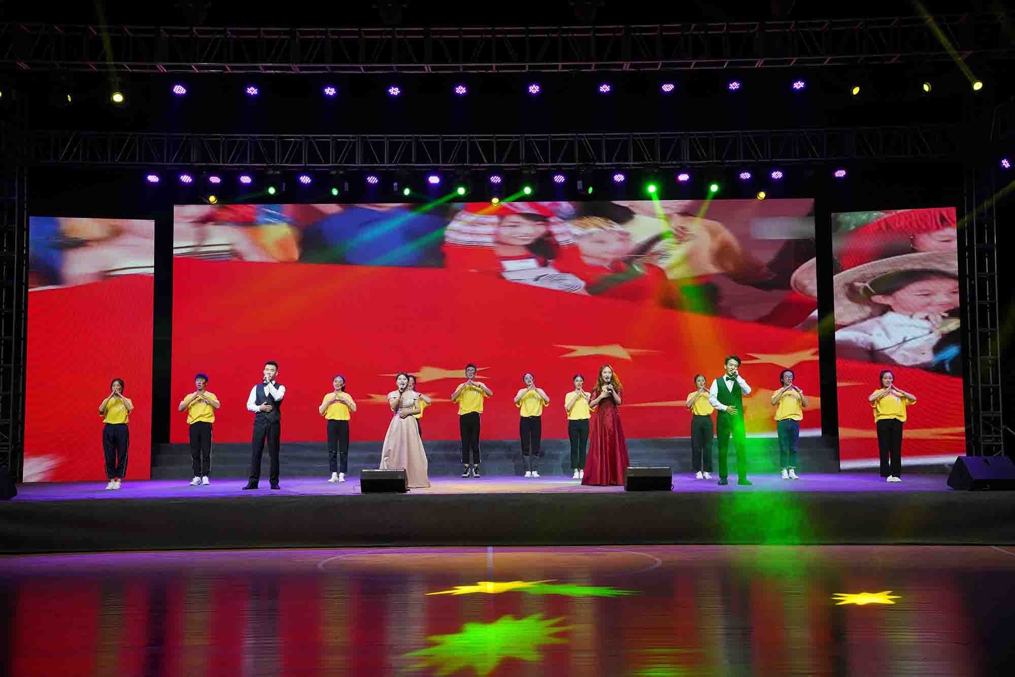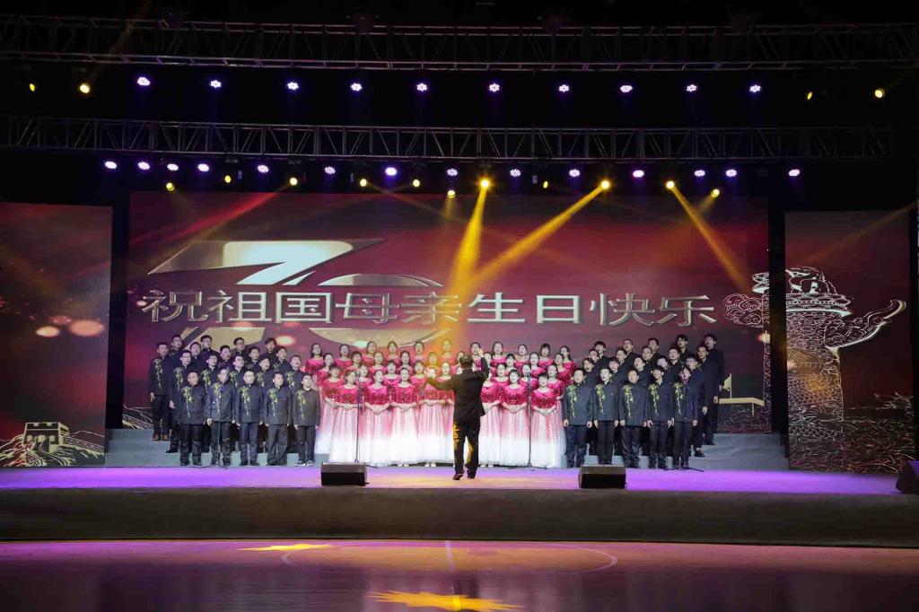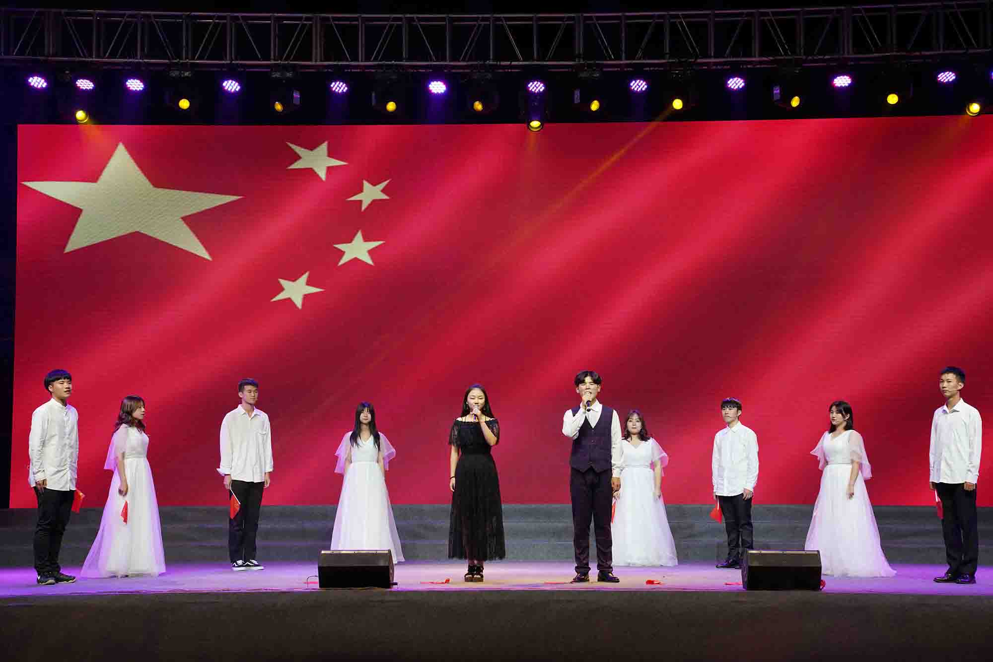 新生辅导员代表怀揣着对祖国的敬意,与精神饱满的合唱队队员、灵动的舞蹈队员共同献上了一首《今天是你的生日》,以此来传递他们对新中国成立七十周年最诚挚的祝福。“家是最小国,国是千万家。”同学们将浓烈的家国情怀融入到整齐划一的手语操和惊起梁尘的歌声中。一首《国家》饱含了民族强大的凝聚力和建设更好祖国的决心。《我爱你中国》毫不吝啬地对祖国进行告白,曼妙的舞姿、挥动红旗的臂膀和高昂的男声独唱无一不在歌颂着我们伟大的母亲——中国。《东方之珠》掷地有声的青年之声让人豪情万丈,爱国之情涌上心头,为实现我国伟大复兴的中国梦增光添彩!《可爱的中国》歌颂了祖国宏伟的历史。表达出新时代青年不忘历史,继承先烈遗志,立志报效祖国的理想抱负。祖国的赞歌慷慨激昂,《红旗飘飘》用歌声传递了信念与祝福,愿伟大的祖国永远繁荣富强!晚会在学院教职工合唱团气势恢宏的大合唱《保卫黄河》《我和我的祖国》中圆满落幕。