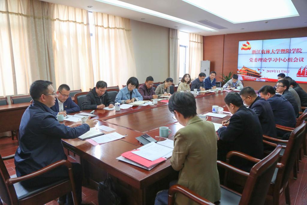 11月8日,学院召开党委理论学习中心组扩大会议, 学习贯彻党的十九届四中全会精神和浙江省委书记车俊在浙江农林大学指导主题教育时的讲话精神。校党委委员、组织部部长童晓晖出席会议。学院党政班子成员,院办、组织人事部、学工部负责人,各党总支书记参加会议。会议由党委书记潘国忠主持。