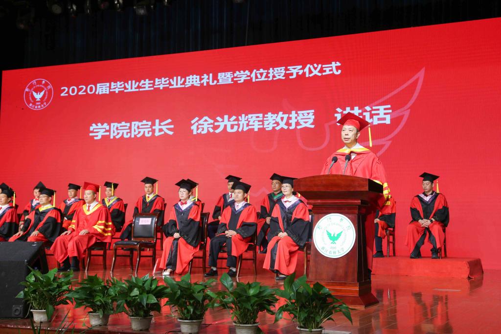 活动中心影剧院内气氛庄重热烈,毕业典礼在庄严的国歌声中开始。随后,全体人员向新冠肺炎疫情牺牲烈士和逝世同胞默哀。徐光辉作题为《千帆竞发 逐浪前行》的讲话,向1742名毕业生以及他们的家人和亲友表示最热烈的祝贺,向悉心指导他们的老师表示最衷心的感谢;对此次疫情期间涌现出的一大批抗疫优秀毕业生榜样表示致敬;对70名省级优秀毕业生、136名院级优秀毕业生和130名成功考取研究生的同学,表示热烈的祝贺。