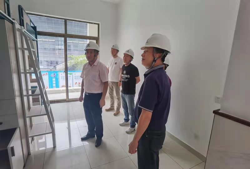 徐爱俊认真听取了施工单位负责人关于工程建设情况的汇报,详细了解建设进度、工程质量、施工安全及下一步安排等情况,实地查看学生公寓房间、卫生间及正在安装的洗脸盆、水龙头等设施设备,并进行现场指导。