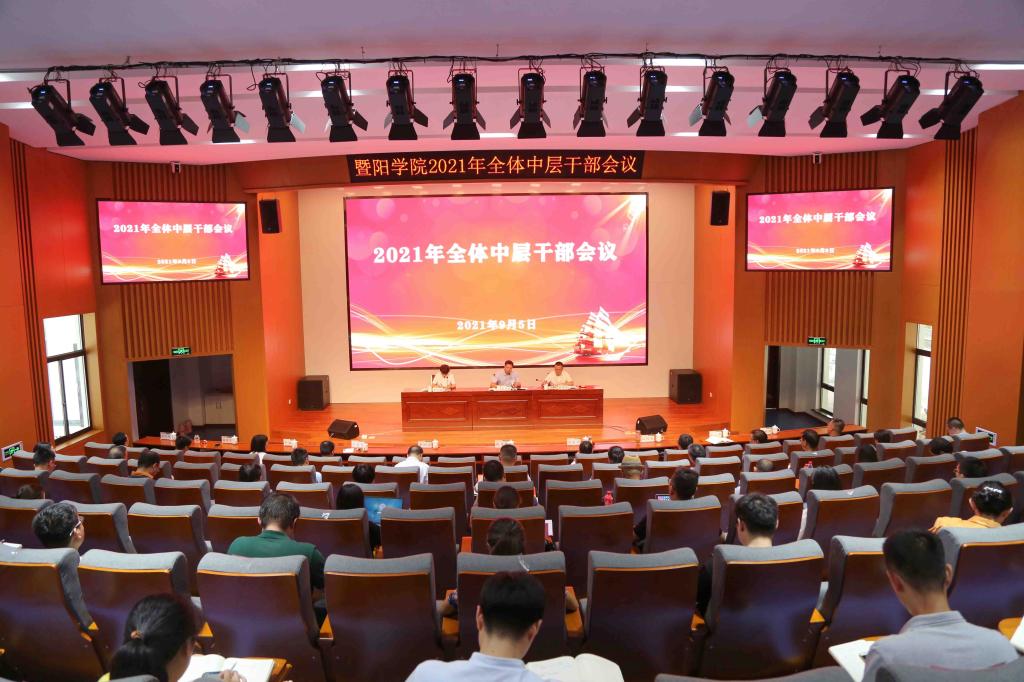 院长徐光辉以《牢记立德树人使命,做奋进担当的暨阳人》为题,全面总结回顾了学院上半年党建思政、疫情防控、人才培养、科研创新、师资队伍、校地合作、综合保障等方面的成绩,并对暑期尽心尽责、坚守岗位的工作人员给予充分的肯定。徐光辉强调,学院正处于发展的关键期,全体中层干部要不忘初心,坚守与担当,全面扛起肩上的重担,推动学院稳定发展。对于如何开展2021年下半年工作,徐光辉提出三点要求:一是要坚定党建领航,思政铸魂。进一步加强党员干部的理想信念,从党史学习教育中汲取力量,以更好的状态做好各项工作;要进一步加强师德师风建设,增强服务意识,发扬优良作风,守住底线,正确履行职责,关心关爱学生。二是要坚持育人为本,学术为基。要聚焦聚力本科教育和人才培养,深化本科教学改革,同时要构建教师培训体系,实现教师业务能力和教学水平、教学成果的全面提高,进一步提升科学研究和社会服务水平。三是要坚守师生至上,服务第一。切实做好学院各项基础设施建设及师生学习生活条件保障,打造更加信息化、智能化的美丽校园,营造“服务育人”的和谐氛围。