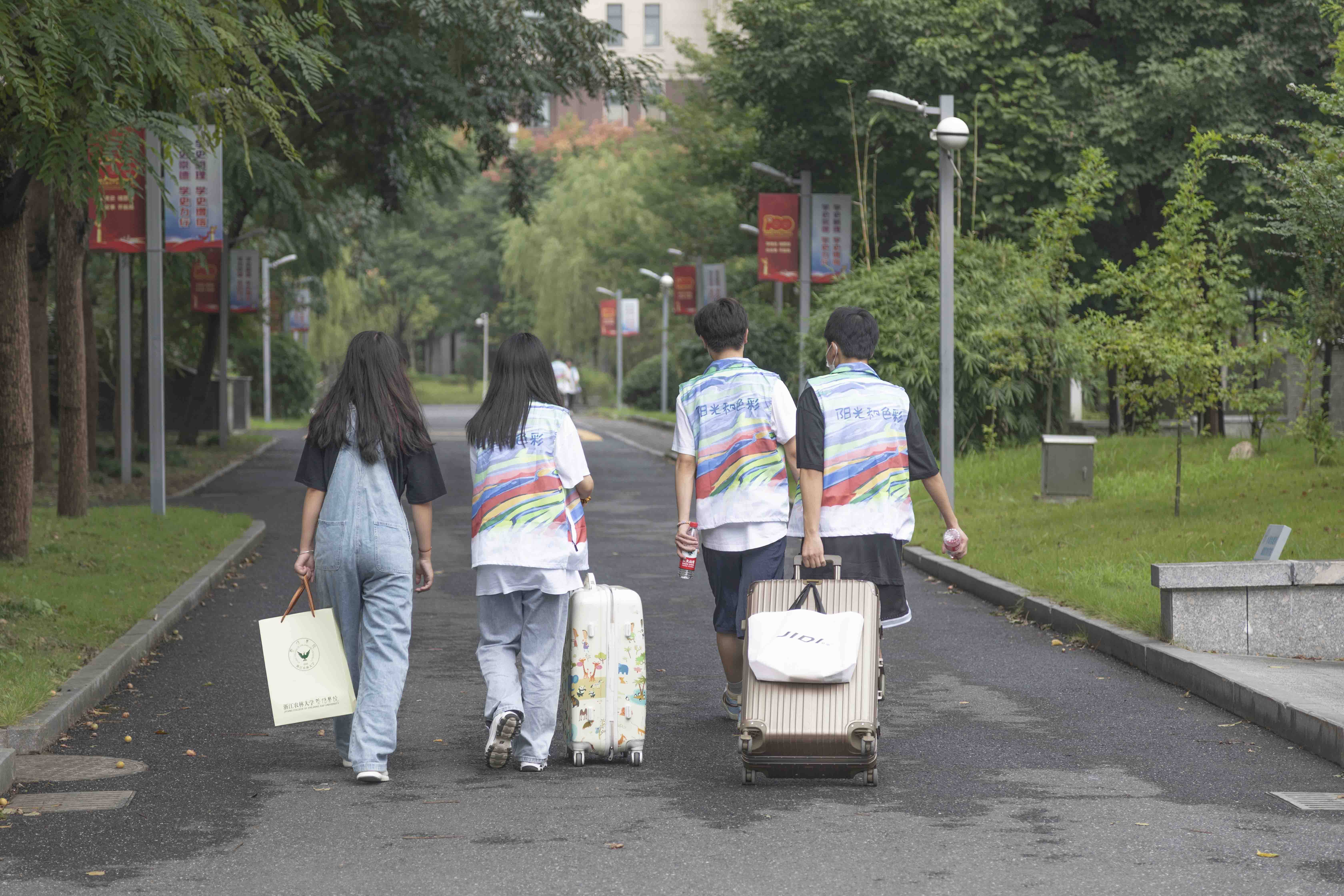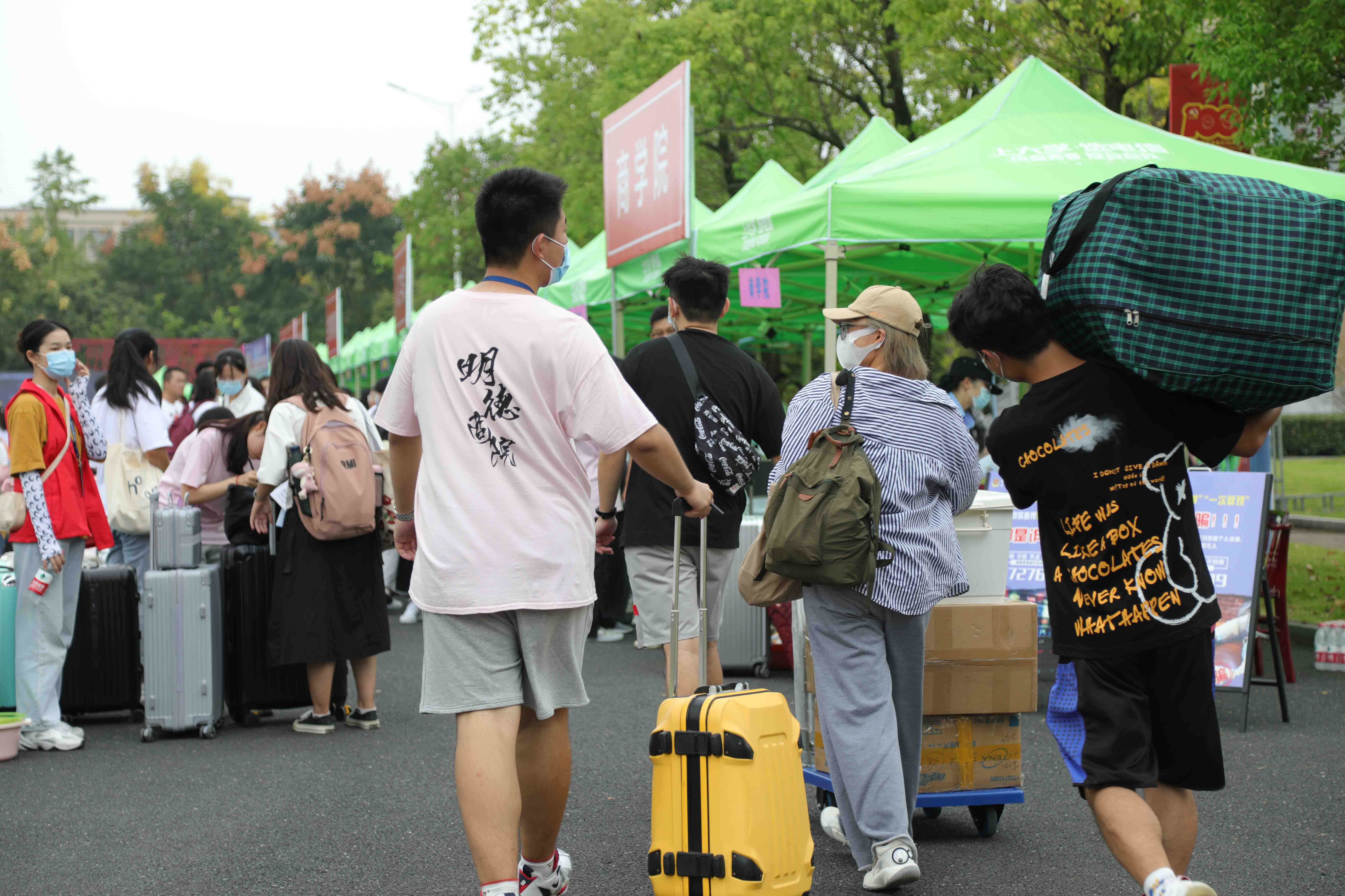 走过大门,银杏大道两侧排列着各学院的报道帐篷。为了迎接新生们的来到,报道“大礼包”里装进了各二级学院精心准备的特色纪念礼物。
