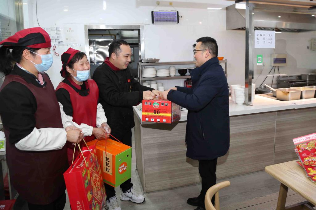 潘国忠一行先后走访了学院南大门、物业、体育中心和食堂,向寒假坚守岗位的教职员工送上慰问品和新春祝福,感谢他们一如既往的辛勤劳作,并祝大家身体健康。