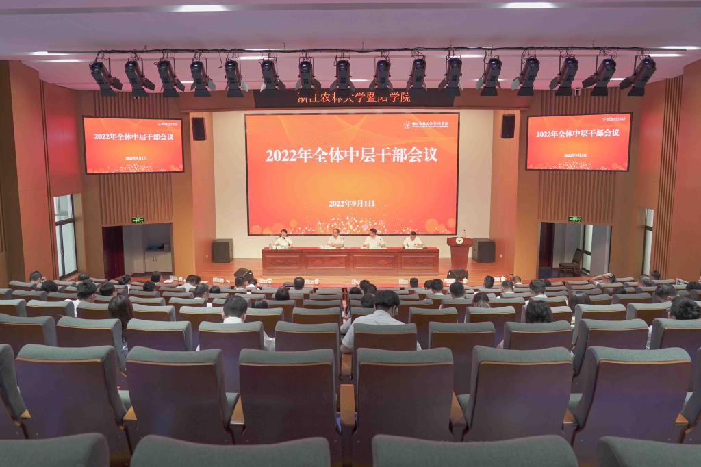 9月1日,学院在人文5111智能报告厅召开全体中层干部会议。浙江农林大学党委委员、副校长胡祖吉,校办副主任钱晓虎,学院领导徐光辉、洪昀、李文莉、吴正金、金松恒、高国俊、李叔君出席会议。