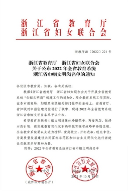 近日,浙江省教育厅、浙江省妇女联合会联合发布了《关于公布2022 年全省教育系统浙江省巾帼文明岗名单的通知》(浙教厅函〔2022〕221号文件),学院外语系获得全省教育系统省级“巾帼文明岗”荣誉称号。