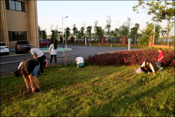 当天下午5:30,参加除草活动的同学们分成6个作业小组,来到各自的任务区域开始各自的工作。没有开始的口号,只有无声的行动;没有路人的赞赏,只有内心满溢的幸福。在现场,同学们积极劳动,人人争先,个个向前,发扬不怕苦、不怕脏、不怕累的精神。男生主动承担起脏活、累活、重活,女生们也不甘示弱,纷纷弯腰下蹲,开始了紧张辛苦的杂草清除。整场活动分工协作,有条不紊,处处呈现出一派热火朝天的劳动景象。尽管泥土弄脏了衣服和鞋子,蚊虫叮咬着大家的身体,汗水浸湿了衣背,但近400名“90后”同学全然不顾,专心致力于杂草清除工作,整个活动持续近1个半小时,直到华灯初上才纷纷离开作业区域。