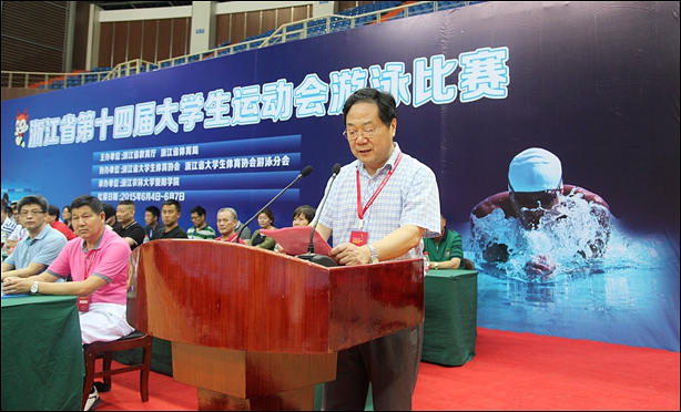 中国大学生体育协会游泳分会副主席、浙江省大学生体育协会游泳分会主席、浙江财经大学副书记钟晓敏宣布浙江省第十四届大学生运动会游泳比赛开幕。