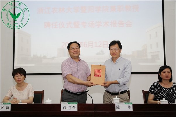 聘任仪式上,石道金为陈华颁发学院兼职教授聘书并宣读浙江农林大学诸暨创新发展研究院院长助理任命文件,对陈华教授的加盟表示欢迎和感谢。石道金指出,浙江农林大学诸暨创新发展研究院致力于集聚国内外著名专家学者,为诸暨市经济社会发展努力打造融智平台,促进校地合作,实现共赢发展。学院高度重视人才引进工作,聘请高层次、高水平人才作为兼职教授是学院高水平发展、加快学科建设和提升人才培养质量的重要战略措施。他希望陈华教授充分发挥他学术影响和研究专长,为学院和浙江农林大学诸暨创新发展研究院发展提供智力支撑,发挥积极作用。