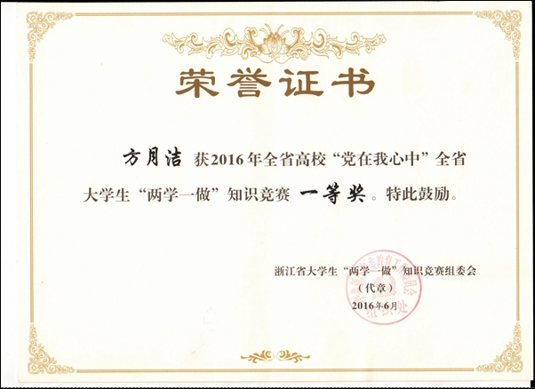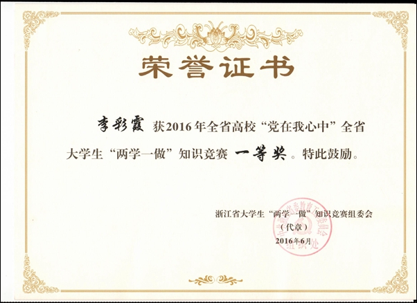 本网讯 日前,从浙江省大学生“两学一做”知识竞赛组委会获悉,“党在我心中”全省大学生“两学一做”知识竞赛顺利落幕。永利官网园林艺术系方月洁、人文系李彩霞两位同学荣获一等奖。