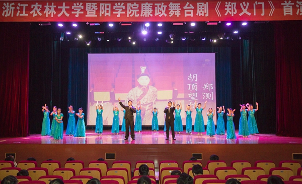 廉政舞台剧《郑义门》由学生自编自导自演,历时近一年精心制作完成。为了使该舞台剧能更加精准地表达“郑义门”的核心要义,学院玉玄鸟艺术团的同学们多次前往浦江县江南第一家,在“郑义门”的发源地切身感受其内在精神。逐条学习“郑义门”168条家规所蕴含的优秀传统文化内涵,并利用课余时间将其艺术化呈现。首演现场掌声频频响起,好评如潮。