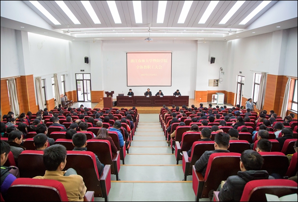 本网讯 2月19日下午,学院召开全体教职工大会,总结2016年工作,表彰先进典型,谋划2017年发展。院领导石道金、修树东、李文莉、张晓优出席大会。大会由副院长修树东主持。