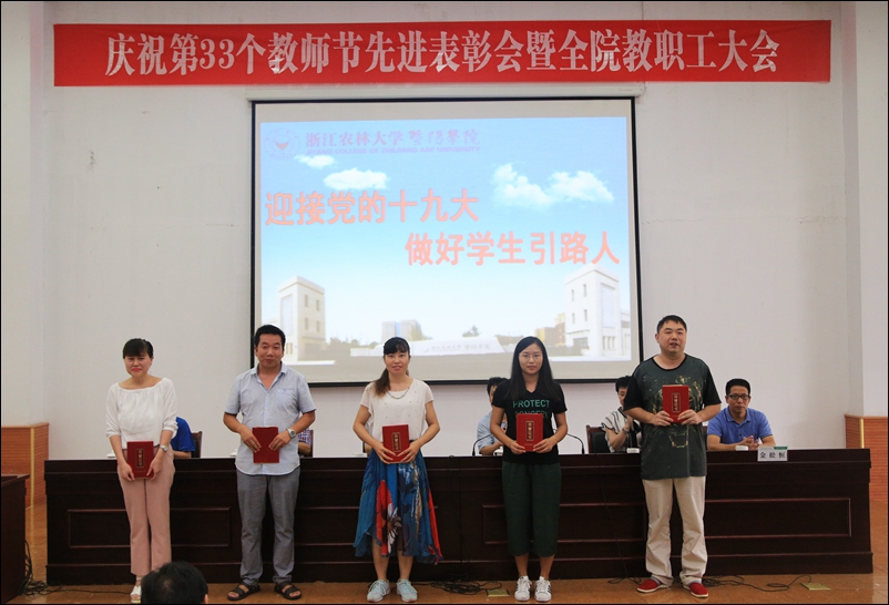 副院长金松恒宣读了从事教育工作满三十周年的教职工、学院第二届“我心目中的好老师”表彰文件、学院第十届青年教师教学技能比赛获奖名单、绍兴市2016学年高校优秀辅导员等表彰文件。与会领导为受表彰教师颁发荣誉证书。
