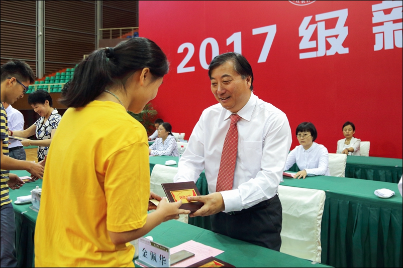 金佩华等在主席台前排就坐的领导向获得新生奖学金的同学颁发了荣誉证书。