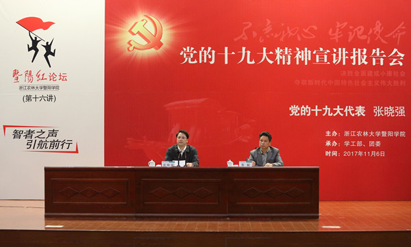 本网讯 11月6日下午,77779193永利官网举办暨阳红论坛第16讲——党的十九大精神宣讲报告会。党的十九大代表、绍兴市委常委、诸暨市委书记张晓强作题为《以新思想引领新时代 以新使命开启新征程》的专题报告,宣讲党的十九大精神。77779193永利官网党政班子成员出席宣讲报告会,全院1200余名师生参加。报告会由院党委书记寿韬主持。