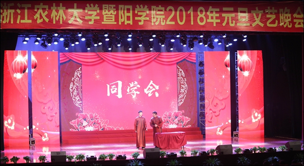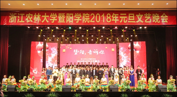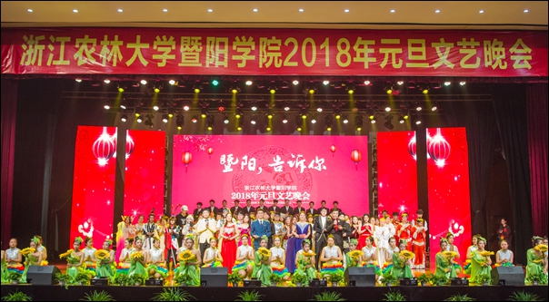 副院长张晓优、金松恒,党委副书记高国俊出席晚会,学院全体中层干部、诸暨相关单位负责人和千余名师生代表欢聚一堂、辞旧迎新、共贺新年。晚会以“暨阳,告诉你”为主题,表达暨阳师生立足诸暨、锐意进取、服务发展的豪情壮志、无限憧憬。