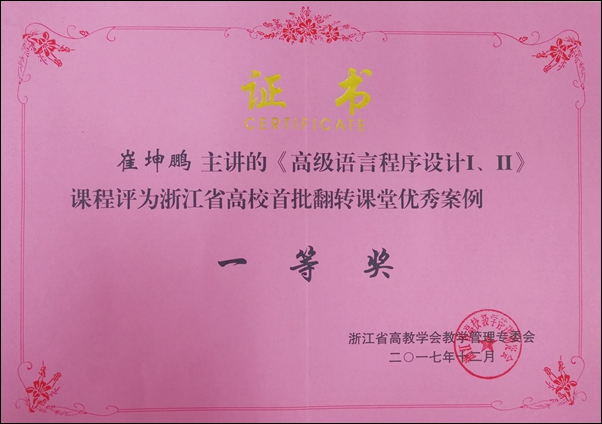 近日,从浙江省高教学会教学管理专业委员会获悉,永利官网崔坤鹏老师课程教学团队申报的“《高级语言程序设计I、II》指尖翻转课堂教学改革实践”荣获浙江省高校首批“翻转课堂”优秀教学案例一等奖。