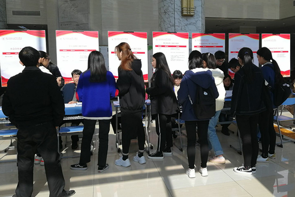 11月23日中午,学院2018-2019学年勤工助学招聘会在图书馆一楼举行。本次招聘会共设44个校内勤工助学岗位,吸引了上百名学生前来参加。