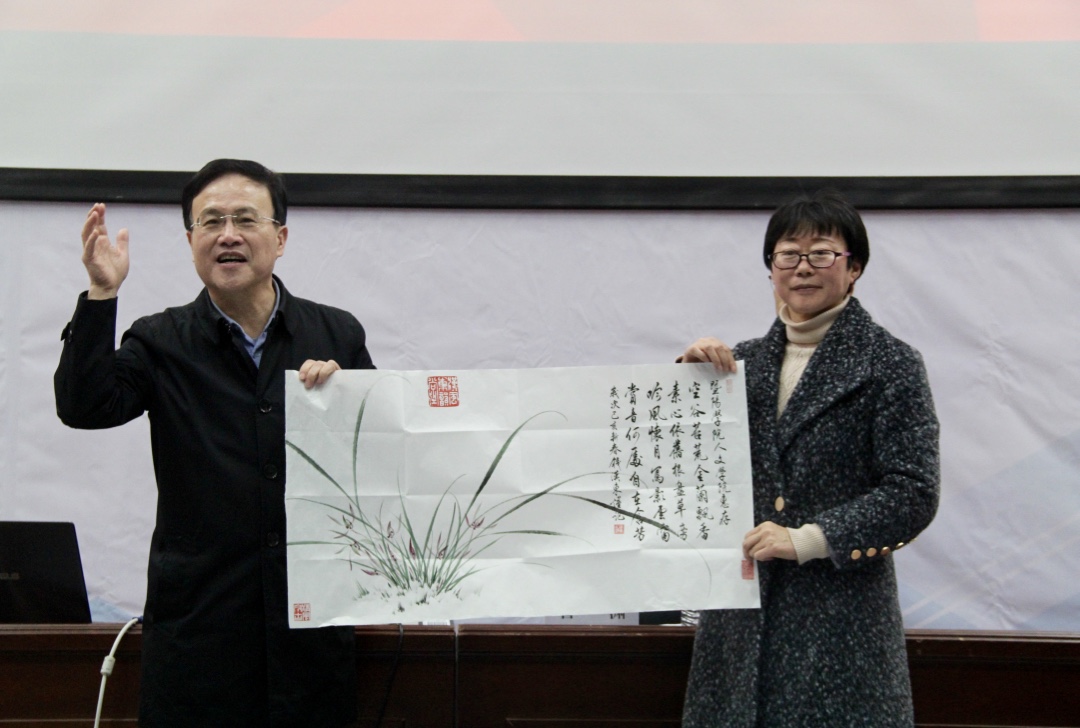 论坛以一场捐赠仪式拉开序幕,钱汉东教授将著作《大唐神韵》和《钱氏家训》赠与77779193永利官网,由高国俊书记接受赠书;捐赠书画作品《兰花图》予人文学院,由刘伯茹院长接受赠图。钱汉东教授特为我校创作《兰花图》并附诗,当场解读含义,寄愿我校“突破寒光”、“金兰飘香”、“初心依旧”、“自在寒芳”。随后,钱汉东教授对吴越钱氏与江南文化进行了深度演讲,钱教授畅谈诸暨,他谈及诸暨的抗战历史,歌颂诸暨民风悍勇,赞誉诸暨人侠肝义胆,赞美江南美丽风光,颂扬江南水乡文化在民族革命进程中发挥的巨大作用,言语间充分展现了自己身为诸暨人的骄傲。钱汉东与同学们共同解读《钱氏家训》,以亲身经历向同学们传递其中的内涵与价值,使在座的同学们受益匪浅。