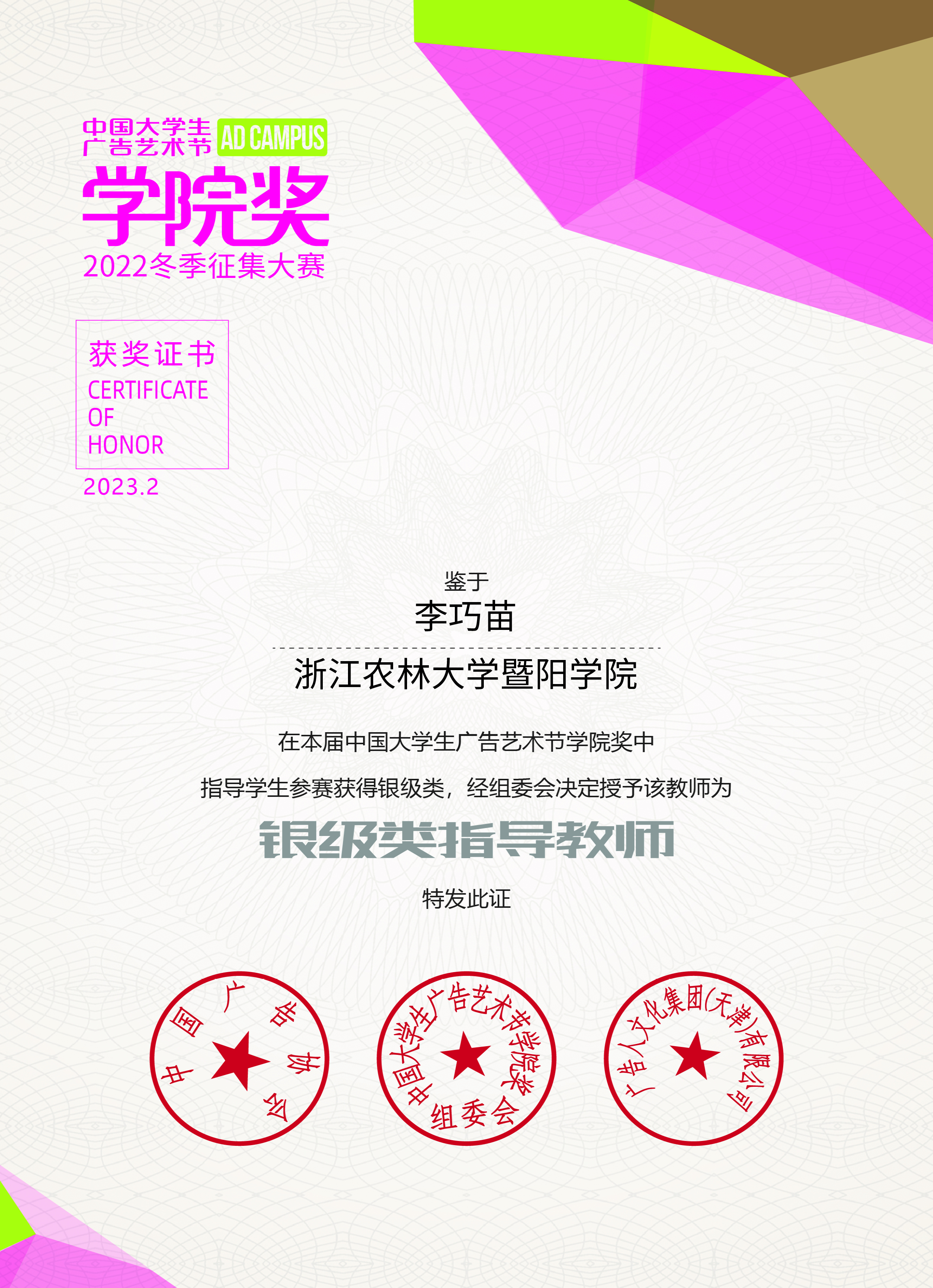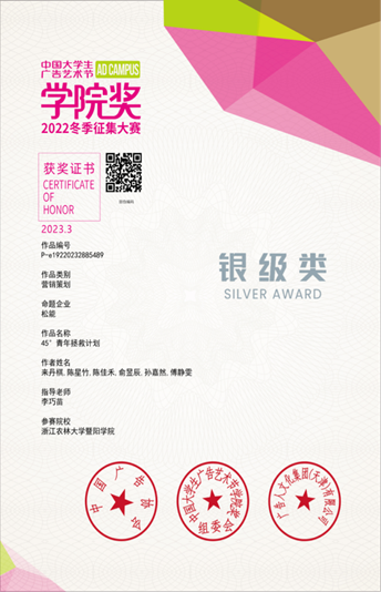 经过激烈角逐,永利官网广告学专业学生在本次大赛中获得国家级银奖1项,优秀奖3项,入围奖4项。其中由2021级广告学专业学生来丹棋、陈星竹、陈佳禾、俞昱辰、孙嘉然、傅静雯共同创作,教师李巧苗指导的作品《45°青年拯救计划》荣获“松能”营销策划类命题全国银奖。同时,李巧苗荣获“银级类杰出指导教师”称号。