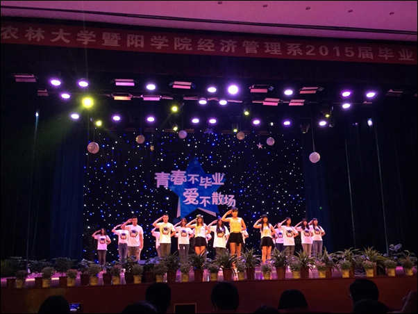 6月18日晚,经济管理系在活动中心举行“青春不毕业,爱不散场”2015届毕业生晚会。学院领导石道金、寿韬、修树东、蔡永华,各系党总支书记与经济管理系师生们共同观看了本次晚会。