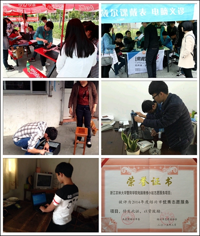 工程技术系以理工科为专业特色,为加强对志愿服务项目引导,鼓励推进志愿服务项目化建设,阳光志愿者服务支队借助专业特色知识搭建“电脑维修小站”项目平台。构建“学生—学校—社会”三层志愿服务体系,积极组织大学生开展社区志愿服务活动,在校内联手戴尔、宏图三胞等专业电脑维修团队为广大师生服务,并先后赴上海城、望云社区、大唐镇里蒋村等地开展电脑义务维修服务,促进学生志愿者们在服务基层和服务人民群众的实践中施展才干、增长见识、锻炼成长,该项目荣获“2014年度绍兴市优秀志愿服务项目”。