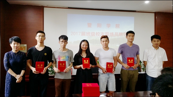 陈航峰宣读了2017届班级校友联络员聘任文件。颁发了2017届班级校友联络员聘书。工管131班周金铃同学作为2017届班级校友联络员代表作表态发言。