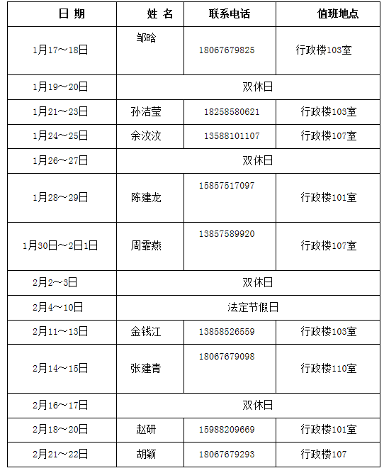 (一)1月17日到1月27日上班,时间为:上午8:00-12:00,下午14:00-17:00。