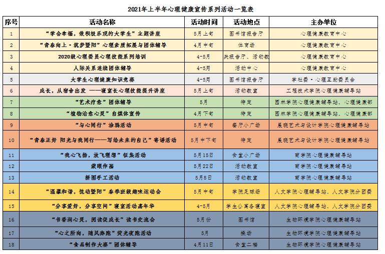 为进一步丰富校园心理文化,营造积极向上的心理育人氛围,现开展永利官网2021年上半年心理健康宣传系列活动,具体活动安排如下表: